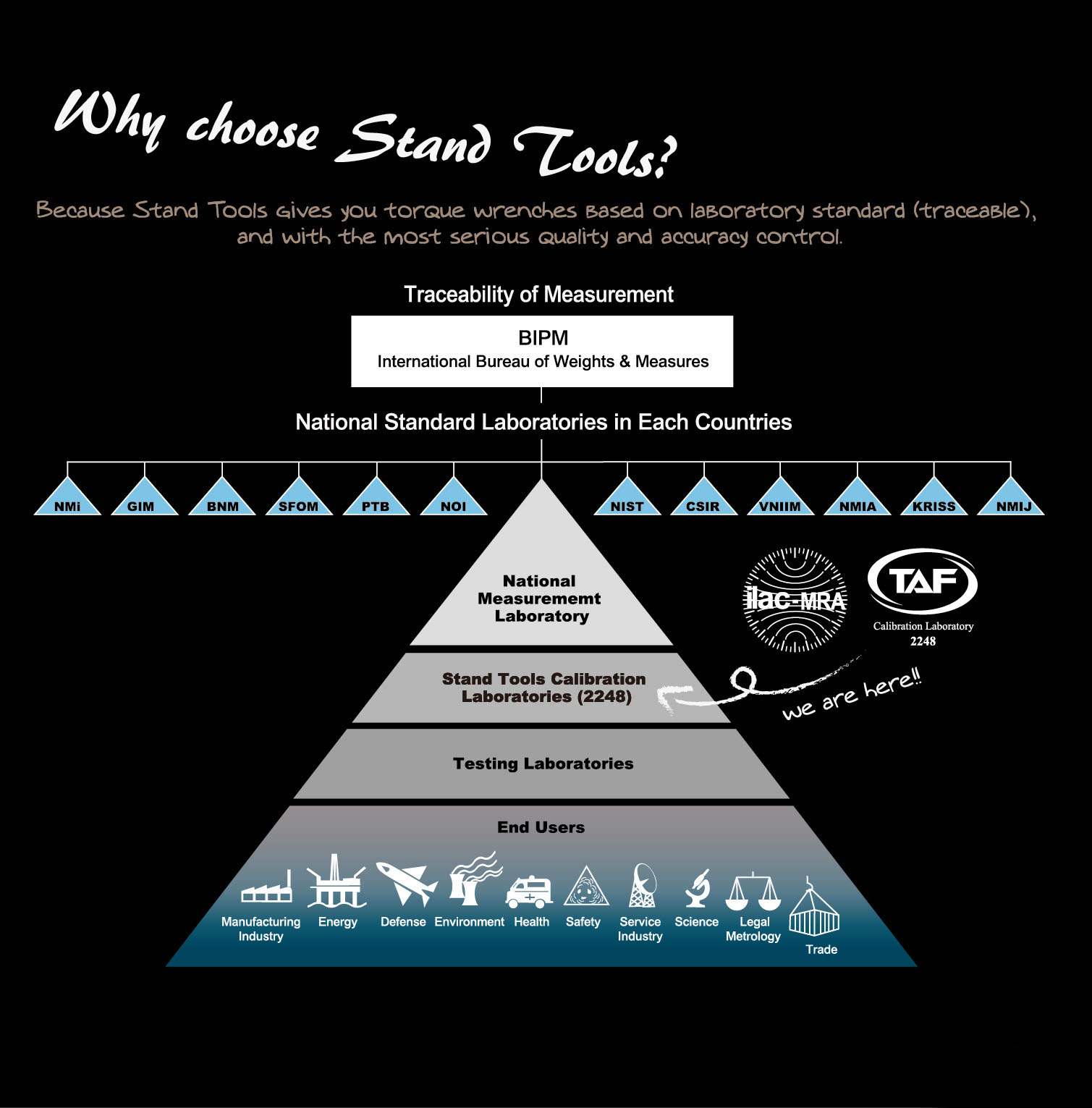 Laboratory accreditation is a method showing the characters, technology, system, and quality control of the lab to the world. The accreditation body, or the Taiwan Accreditation Foundation (TAF), will examine our laboratory, and supervise us if the lab do follow ISO:17025, local laws, international standard, and regulation required by TAF. The lab will be evaluated by the TAF carefully, no matter the quality control or the experiment process and results. Stand Tools Calibration Laboratory is one of TAF’s accredited calibration labs for torque wrenches and torque transducers.